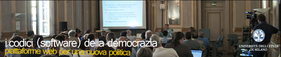 Quando parliamo di piattaforme per l'e-democracy, bisogna chiarirsi di cosa stiamo parlando, e in particolare, sugli obbiettivi che si vuole perseguire. Vogliamo uno strumento che possa far emergere le idee dei cittadini? Vogliamo uno strumento per sviluppare proposte condivise? Vogliamo uno strumen... SIETE TUTTI INVITATI A PARTECIPARE Si svolgerà a Palermo il 26 Settembre 2015 la nuova edizione del convegno dal titolo "Palermo e-democracy". L'incontro sarà ospitato nei locali del Ex Real Fonderia alla Cala - Piazza della Fonderia. Questo evento parlerà sia degli strumenti che degli esempi...