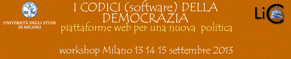 Il workshop si propone di mettere a confronto le caratteristiche di alcune piattaforme software presenti nel panorama italiano, con particolare interesse verso quelle orientate alla deliberazione, cioè alla raccolta, documentazione, elaborazione, selezione e valutazione di proposte, e di esaminare come queste sono state utilizzate in iniziative di partecipazione che hanno visti coinvolti vari attori del gioco politico: cittadini individuali o organizzati in associazioni, movimenti e partiti, membri delle assemblee elettive, dei governi e delle istituzioni. Le sessioni di presentazione e approfondimento di specifici software e loro sperimentazioni in “real-life” si alterneranno a momenti di dibattito sugli scenari culturali e politici presenti e in divenire.