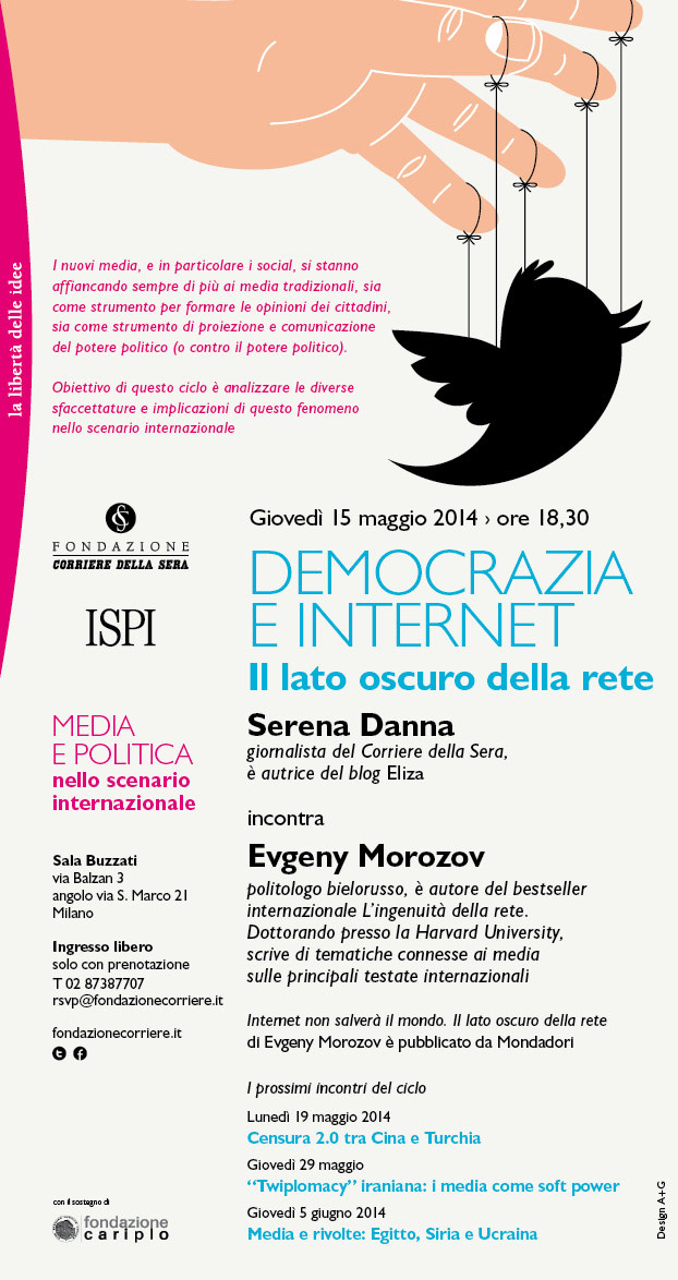 Evgeny Morozov a MilanoGiovedi 15 maggio presso la Fondazione Corriere della Sera - Sala Buzzati in via Balzan 3. l'autore del famoso volume L’ingenuità della rete. Il lato oscuro della libertà di internet (Torino, Codice, 2011) sarà a Milano a discutere di democrazia e internet. Necessaria prenotazione. Info nel volantino o ai link allegati. Opinioni sull'autore? Commenti (0)
