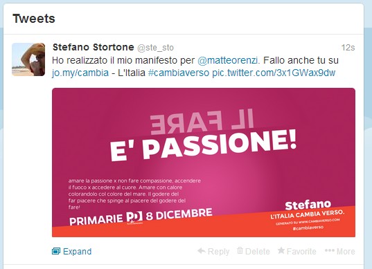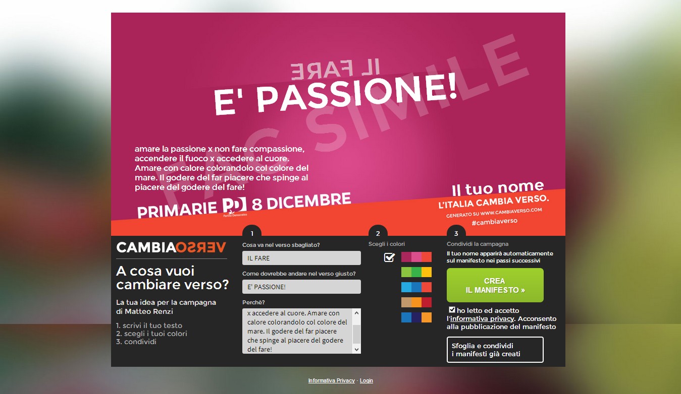 CAMBIAVERSO...partecipazione o marketing elettorale?Signori e Signore, se fosse uscito prima avremmo avuto un altro sito di idea-gathering su cui discutere durante il WS. :) Grazie a Michele D'Alena (partecipante al workshop) ed al suo post, oggi ho scoperto il nuovo sito e progetto elettorale di Matteo Renzi per le prossime primarie del PD. Interessante e da guardare con attenzione per una ragione principale: perchè dietro c'è una grande agenzia di comunicazione dunque esperti da cui attingere per conoscere cose su loro cui avranno ben studiato. Da questo punto di vista mi è piaciuto molto, perchè è la prima volta che mi capita di vedere, il puntare sui colori da assegnare ai propri messaggi... Ma, passata la nota benevola, la domanda seria che mi pongo e vi pongo è la seguente: un'agenzia di comunicazione può elaborare progetti di partecipazione? Detto in modi più brutali, l'attività su questo sito si può definire partecipazione? La partecipazione qui disegnata è finalizzata alla partecipazione oppure è strumentale alla mera elezione del candidato Renzi? E come vanno considerati dunque questi progetti? Ovviamente, e trovando conferma "partecipando" sul sito, le risposte sono alquanto ovvie per i partecipanti del Workshop e i sostenitori di questo sito dove stiamo scrivendo... Dunque mi sono divertito un po' e ho interagito, creando il mio Manifesto per l'Italia...